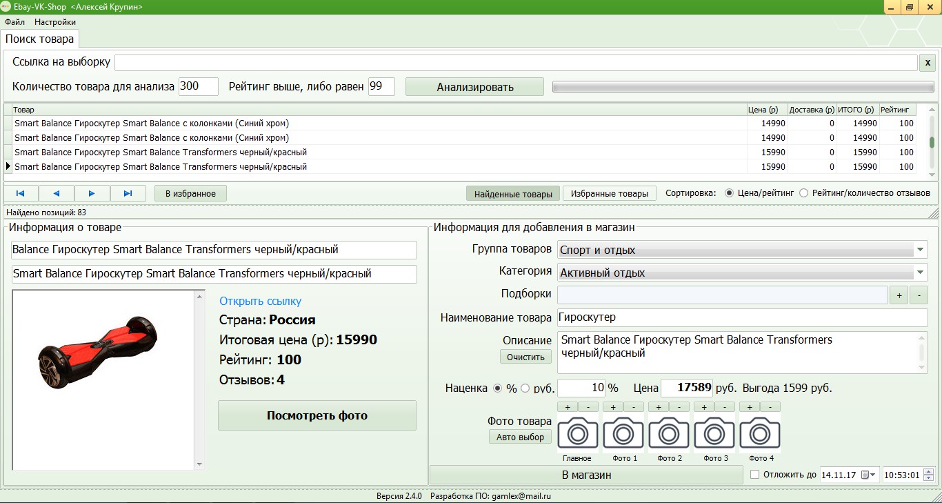 Подходящий найденный товар можно тут же выложить в качестве товара в магазин Вконтакте с нужной наценкой. Для этого всего лишь нужно выбрать категорию, заполнить название и нажать кнопку.